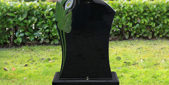 Grabstein mit Sockel für Einzelgrab, Grabstein mit Lilien, Natursteinmuster: Indian Black / Aurora
